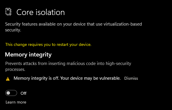 ### Disable Memory Integrity